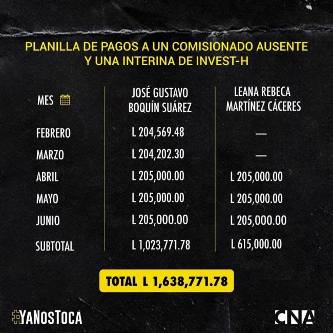 En total el Estado de Honduras ha pagado la cantidad de L1,638,771.78 en concepto de salarios a favor de un comisionado ausente y una comisionada interina con duplicidad de funciones. “Estos honorarios ilegítimos producidos por la interventora de Invest-H representan una grave lesión a los recursos públicos”, afirma el CNA.