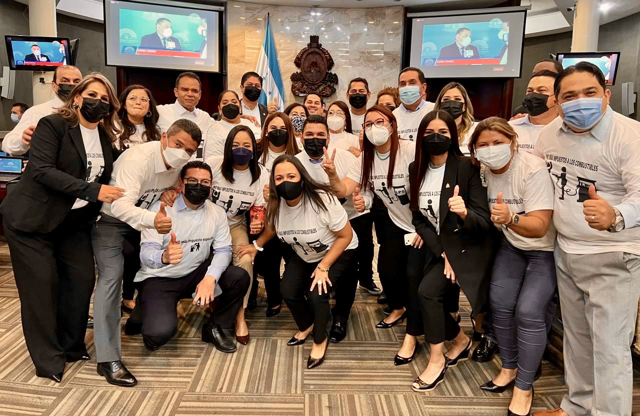 Con mensajes alusivos en sus camisetas, la bancada del Partido Nacional reclamó hoy en el Congreso Nacional, la eliminación del impuesto a los combustibles.