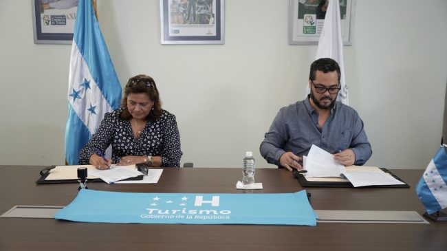 La ministra de Turismo, Yadira Gómez, y el presidente de la junta directiva de la FIB, Diego Lanza Consuegra, efectuaron la firma de dicho convenio, mismo que pretende impulsar el Festival Anual de Orgullo y Empoderamiento Swamper/ Iguana de Utila.