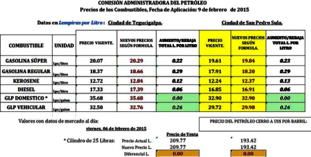 El comunicado establece que solamente se mantiene el precio del cilindro de 25 libras del gas LPG doméstico en 193.32 de lempira para San Pedro Sula y 209.77 para Tegucigalpa.