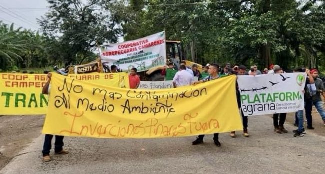 La Plataforma Agraria Regional de Valle del Aguan y la Coordinadora de Organizaciones Populares de Aguan (COPA), denuncia que miembros de la Cooperativa Camarones fueron desplazados de manera forzosa por parte del grupo criminal conocido como “Los Cachos” quien es coordinado y mantiene permanente y estrecha relación con la empresa agroindustrial Dinant.